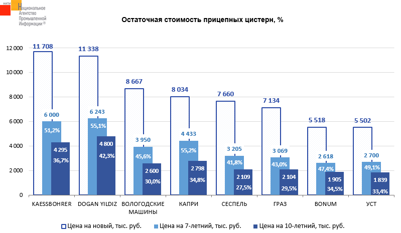 Маркетинговое агентство НАПИ (Национальное Агентство Промышленной Информации) обновило отчет «Остаточная стоимость прицепов и полуприцепов» по итогам 4 квартала 2024 г. Среди представленных на графике семилетних и десятилетних прицепных цистерн дороже всего в четвертом квартале 2024 года можно было продать DOGAN YILDIZ, средняя цена которого составляла 6 243 0000 и 4 800 000 руб. соответственно. Лидером же по сохранности остаточной стоимости по отношению к цене новой в 4 квартале 2024 года прицепной цистерны через 7 лет эксплуатации стала техника КАПРИ. Так, продав семилетнюю цистерну, владелец мог приобрести новую цистерну КАПРИ, доплатив всего 44,8% от ее цены в 4 квартале 2024 г. Через 10 лет эксплуатации лидировал DOGAN YILDIZ, владелец мог приобрести новую цистерну DOGAN YILDIZ, доплатив 57,7% от ее цены в 4 квартале 2024 г.