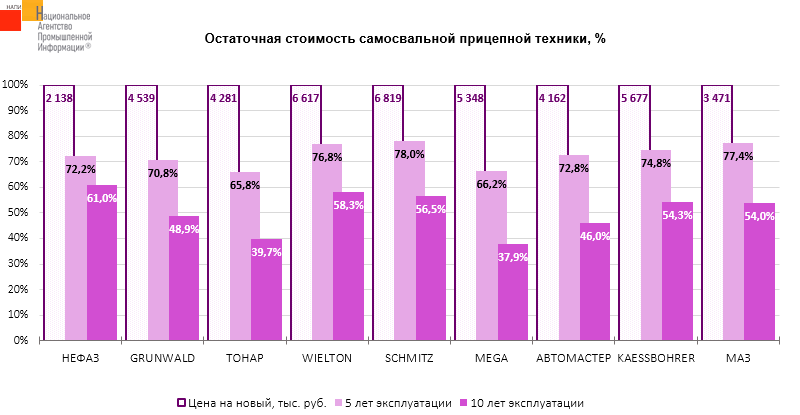 Маркетинговое агентство НАПИ (Национальное Агентство Промышленной Информации) обновило отчет «Остаточная стоимость прицепной техники» по итогам 1 квартала 2024 г. Среди представленной на графике самосвальной прицепной техники лидером по сохранности остаточной стоимости через 5 лет эксплуатации стал SCHMITZ, который сохранил 78% от стоимости новой техники в 1 квартале 2024 г. Через 10 лет эксплуатации лидирует НЕФАЗ, который сохранил 61,0% от цены новой техники в 1 квартале 2024 г.