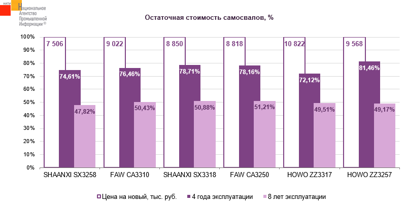 Маркетинговое агентство НАПИ (Национальное Агентство Промышленной Информации) обновило отчет «Остаточная стоимость грузовых автомобилей» по итогам 4 квартала 2023 г. Среди популярных самосвалов, представленных на графике, лидером по сохранности остаточной стоимости через 4 года стал HOWO ZZ3257, который сохранил 81,46% от цены нового самосвала. Через 8 лет эксплуатации лидирует FAW CA3250 с остаточной стоимостью 51,21% от цены нового самосвала.