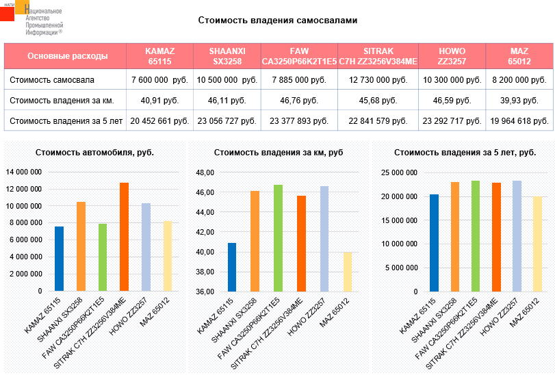 Маркетинговое агентство НАПИ проанализировало стоимость владения самосвалами в г. Москва. Условия расчёта: срок владения 5 лет, ежегодный пробег 100 000 км, покупка за собственные средства. Интересно отметить, что при сопоставимой стоимости российского KAMAZ 65115 и китайского FAW CA3250P66K2T1E5, самосвал от КАМАЗа выигрывает у китайского конкурента 5,2 руб. с км пробега.
