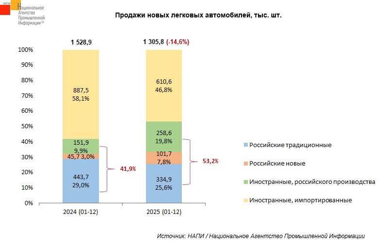 За 12 месяцев было продано 610,6 тыс. ед. легковых автомобилей иностранных импортируемых брендов, что на 31,2% меньше, чем за аналогичный период 2024 года. Продажи автомобилей традиционных российских брендов сократились на 24,5% и составили 334,9 тыс. ед. Также в 2025 году было продано 258,6 тыс. ед. автомобилей иностранных брендов, произведенных в России, продажи выросли на 70,2%. Еще 101,7 тыс. ед. реализованных автомобилей были новыми российскими брендами, они показали рост продаж на 122,5%.