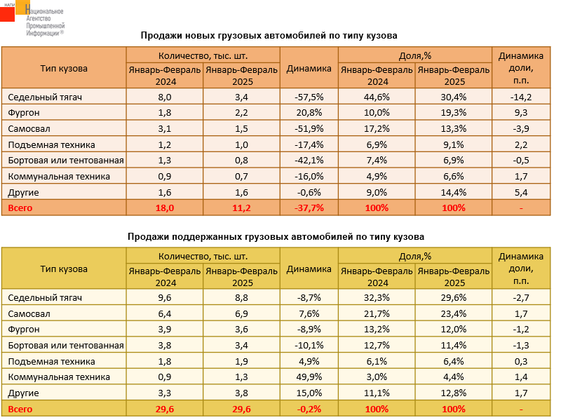 По данным маркетингового агентства НАПИ, в январе-феврале 2025 года изменилась структура рынка новых грузовых автомобилей. Так на падающем рынке выросли продажи фургонов, что позволило им нарастить долю до 19,3%. Снижение продаж коммунальной и подъемной техники было не такое сильное, как у рынка в целом, благодаря чему они нарастили долю до 6,6% и 9,1% соответственно. Сильнее всего упал спрос на седельные тягачи и самосвалы. Рынок подержанных грузовиков был более стабильный, продажи снизились всего на 0,2%. Продажи подержанных самосвалов, подъемной и коммунальной техники выросли, особенно впечатляющими были темпы прироста по коммунальной технике (+49,9%).