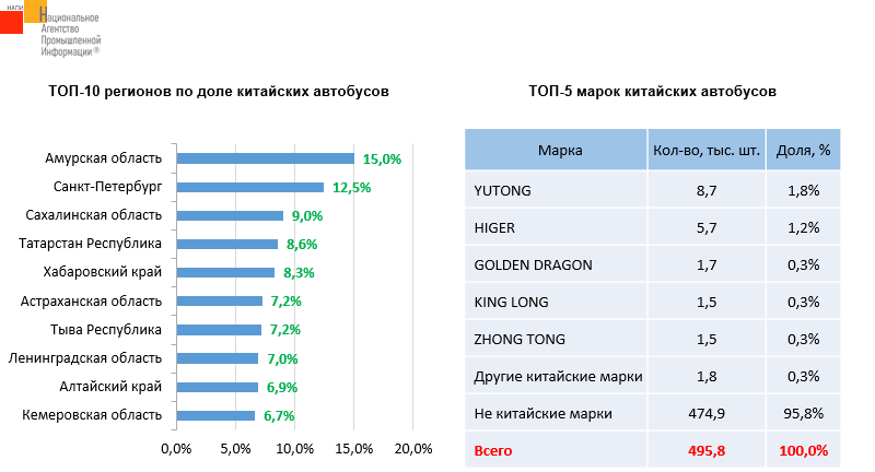По данным маркетингового агентства НАПИ, в парке автобусов на 01.07.2024 г. насчитывается 20,9 тыс. китайских автобусов. Техника китайских марок занимает 4,2% в структуре автобусного парка, в 25 российских регионах эта доля выше. Самый популярный китайский бренд – YUTONG, на долю которого приходится 42% всех китайских автобусов в России.