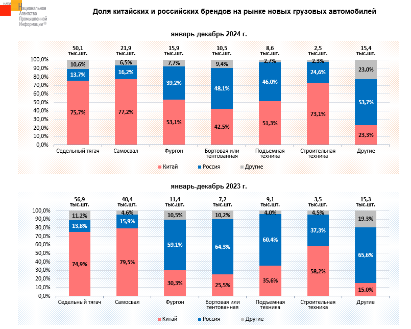 По данным маркетингового агентства НАПИ, по итогам января-декабря 2024 г. доля китайской техники на рынке новых грузовых автомобилей составила 62,1%. Годом ранее китайские грузовики занимали 60,9% рынка. В сегменте самосвалов доля китайской техники сократилась на 2,3 п.п. Больше всего китайские автопроизводители нарастили долю в таких сегментах как фургоны (+22,8 п.п.), бортовые или тентованные грузовые автомобили (+17,0 п.п.), подъемная техника (+15,7 п.п.), строительная техника (+14,9 п.п.). Доля российских брендов за год сократилась с 29,6% до 27,7%.