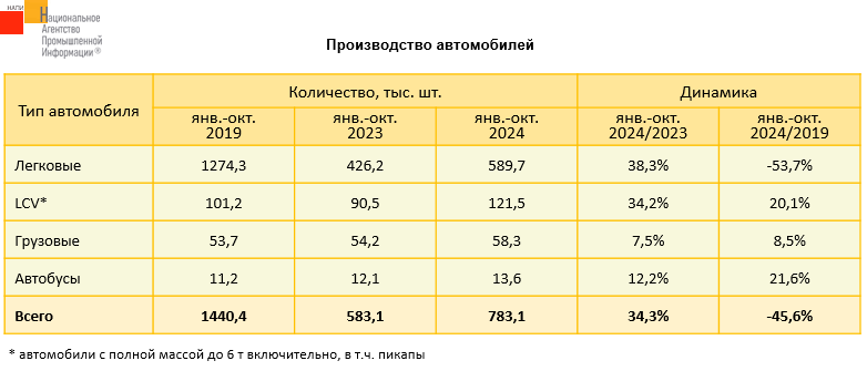 По данным маркетингового агентства НАПИ, производство всех типов автомобилей за десять месяцев 2024 года выросло на 34,3% по сравнению с аналогичным периодом 2023 года. Тем не менее, по сравнению с благополучным 2019 годом производство автомобильной техники сократилось на 45,6% из-за резкого снижения выпуска легковых автомобилей. Производство же всех типов коммерческой техники в 2024 году возросло по сравнению с 2019 годом, особенно в сегменте легких коммерческих автомобилей (+20,1%) и в сегменте автобусов (+21,6%).