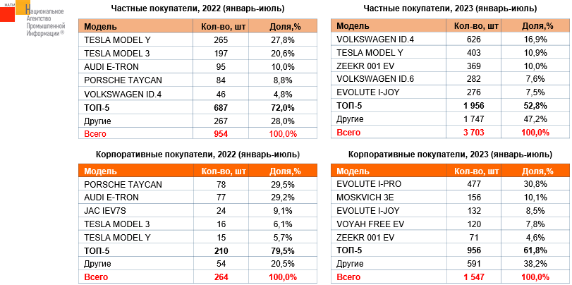 Маркетинговое агентство НАПИ проанализировало спрос на электромобили со стороны частных и корпоративных покупателей. По итогам семи месяцев 2023 г. продажи электромобилей частным покупателям выросли на 288%, автовладельцы в первую очередь выбирали VOLKSWAGEN ID.4, TESLA MODEL Y, ZEEKR 001 EV. На долю немецких электромобилей пришлось 34% рынка, китайские электромобили заняли 31%, российские «эволюты» и «москвичи» - 12%. Продажи электромобилей корпоративным покупателям выросли на 486%, бесспорным лидером стал EVOLUTE I-PRO, который занял почти треть корпоративного рынка электромобилей. На долю российских электромобилей пришлось 49,5% корпоративных продаж, на долю китайских – 31%.