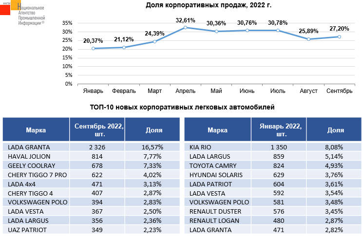 Согласно данным НАПИ (Национальное Агентство Промышленной Информации) за девять месяцев 2022 г. корпоративные клиенты приобрели 124,8 тыс. новых легковых автомобилей, доля корпоративных продаж достигла 25,2 % в структуре рынка новых легковых автомобилей. Следует отметить, что с апреля по июль доля корпоративных клиентов была еще выше и превышала 30%. В ТОП-10 новых корпоративных автомобилей в сентябре кроме российских и китайских автомобилей вошел только VOLKSWAGEN POLO.