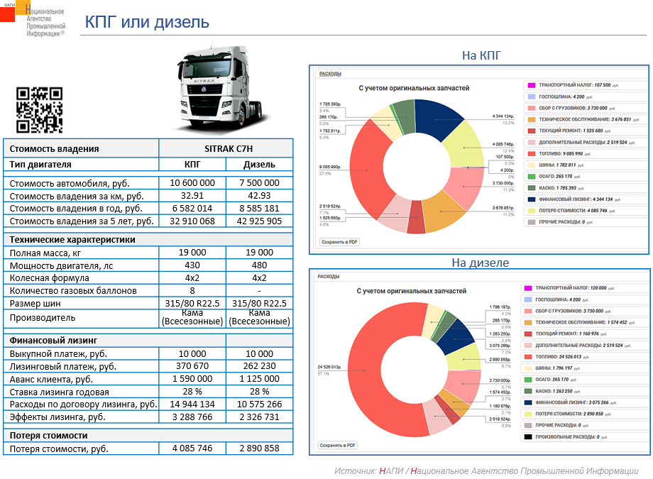 Анализ показал, что покупка тягача на газе изначально обходится дороже, чем тягача на дизеле на 3,1 млн рублей. Однако в ходе дальнейшей эксплуатации тягач на КПГ оказывается выгоднее. Стоимость владения тягачом с газовым двигателем за год на 2 млн рублей дешевле, чем тягачом с дизельным двигателем. Стоимость владения тягачом на газе за пять лет дешевле на 10 млн рублей (30%).