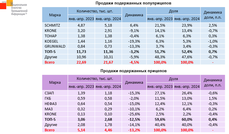 По данным маркетингового агентства НАПИ рынок подержанных полуприцепов в январе-апреле 2024 года сократился на 4,5%, продажи подержанных прицепов снизились на 13,2%. На рынке подержанных полуприцепов лидировал SCHMITZ, на долю которого пришлась почти четверть всех продаж. На рынке подержанных прицепов лидером стал СЗАП, который занял больше четверти рынка.