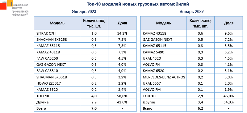 По данным маркетингового агентства НАПИ в январе текущего года продажи новых грузовых автомобилей выросли на 11,7%. Лидером по итогам января стал китайский SITRAK C7H с долей в 14,2%, второе место также досталось китайской модели - SHACMAN SX3258. KAMAZ 65115 занял третью строчку по итогам продаж в январе текущего года. В январе прошлого года ни один китайский грузовик не вошел в десятку лидеров.