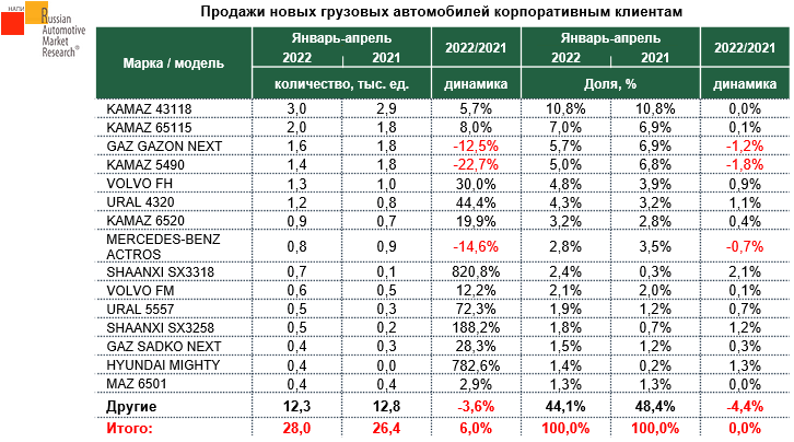 Согласно данным НАПИ / Russian Automotive Market Research продажи новых грузовых автомобилей корпоративным клиентам за январь-апрель 2022 г. увеличились на 6,0% по сравнению с аналогичным периодом 2021 года. В январе-апреле текущего года корпоративные клиенты приобрели 28,0 тыс. грузовых автомобилей. Лидером по темпам роста стала модель SHAANXI SX3318. Спрос на нее вырос на 820,8%, что связано с эффектом низкой базы. Количество проданных новых SHAANXI SX3318 составило 663 единиц техники.