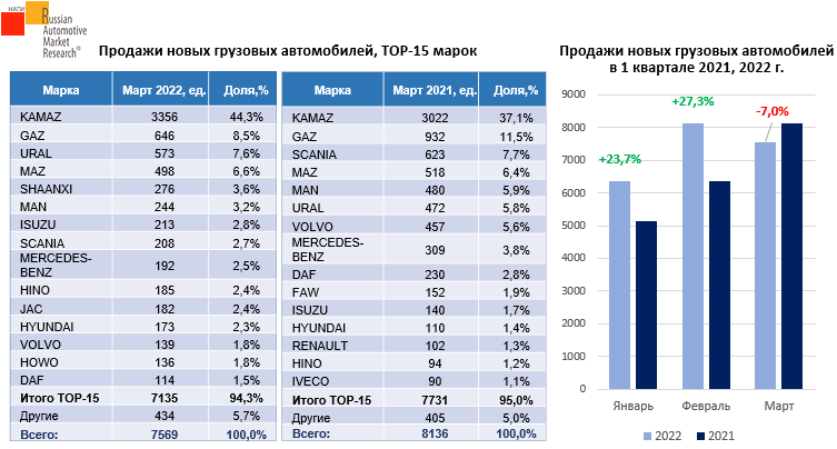 Согласно данным Russian Automotive Market Research рынок новых грузовых автомобилей в первом квартале 2022 г. вырос на 12,2% по сравнению с первым кварталом прошлого года. Рост продаж произошел за счет удачных зимних месяцев, в январе и феврале продажи росли более, чем на 20%. В марте текущего года рынок сократился на 7%. По итогам марта 44% реализованной грузовой техники пришлось на KAMAZ.