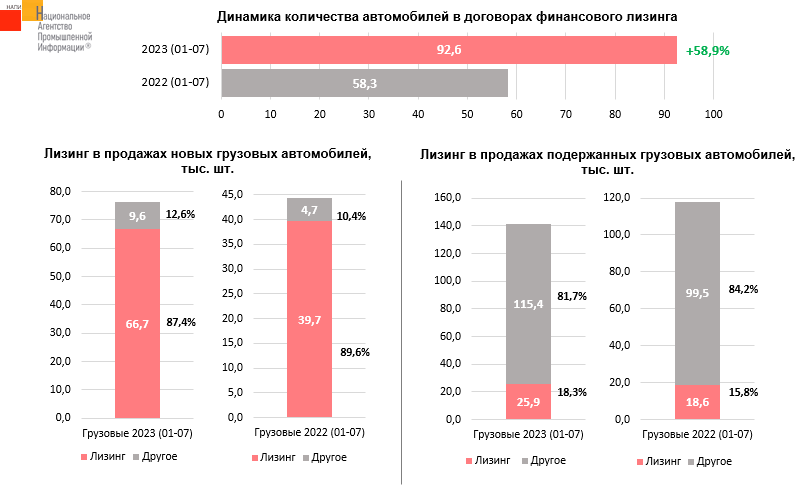 По данным маркетингового агентства НАПИ, за семь месяцев 2023 г. в финансовый лизинг было выдано 92,6 тыс. новых и подержанных грузовых автомобилей, что на 58,9% больше чем годом ранее. На рынке новой грузовой техники доля лизинговых автомобилей по итогам семи месяцев текущего года достигла 87,4%, на рынке подержанной – 18,3%.