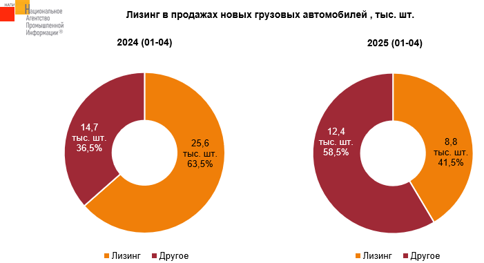 По данным маркетингового агентства НАПИ, за четыре месяца 2025 года в финансовый лизинг было выдано 8,8 тыс. новых грузовых автомобилей*, что на 65,8% меньше, чем годом ранее. Рынок новых грузовиков в январе-апреле 2025 года сократился не так сильно - на 47,6%. В результате доля лизинговых грузовых автомобилей снизилась с 63,5% до 41,5%.