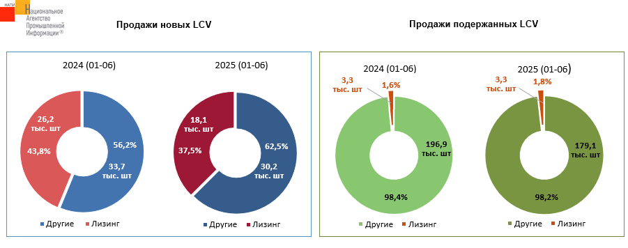 По данным маркетингового агентства НАПИ, в первом полугодии 2025 года лизинг новых и подержанных LCV* упал на 27,7 %: с 29,5 тыс. единиц техники в январе-июне 2024 года до 21,4 тыс. единиц в январе-июне 2025 года. Лизинг новых LCV упал на 31% или 8,1 тыс. штук. В то же время рынок новых легких коммерческих автомобилей сократился только на 19,4%. Доля лизинговых LCV на рынке новой техники в январе-июне 2024 года составляла 43,8%, в аналогичный период текущего года - 37,5%. Доля подержанных лизинговых легких коммерческих автомобилей в первом полугодии прошлого года достигала всего 1,6%, а в 2025 выросла до 1,8%.