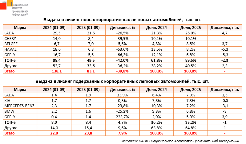 По данным маркетингового агентства НАПИ, за январь-сентябрь 2025 года корпоративными клиентами было приобретено в лизинг* 83,1 тыс. новых легковых автомобилей, что на 39,8% меньше, чем за аналогичный период 2024 года. Также было выдано в лизинг 23,8 тыс. подержанных легковых автомобилей, что на 7,9% больше, чем в прошлом году.