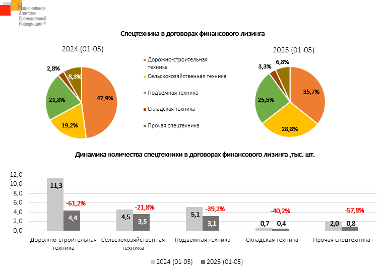 По данным маркетингового агентства НАПИ за январь-май 2025 года было выдано в финансовый лизинг 12,3 тыс. единиц специализированной техники, что на 48% меньше, чем годом ранее, когда было выдано 23,6 тыс. За год существенно изменилась структура лизинга спецтехники. Так из-за более сильного падения, чем по лизингу в целом, значительно сократилась доля дорожно-строительной техники – с 47,9% до 35,7%, а вот доля сельскохозяйственной техники за год выросла на 9,6 п.п.