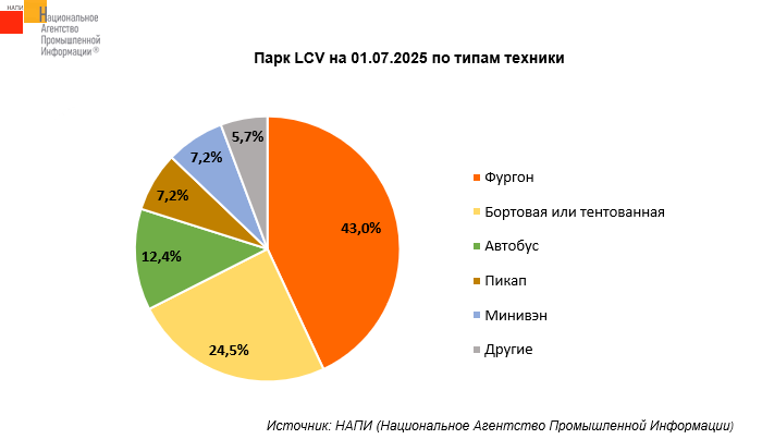 По данным маркетингового агентства НАПИ, в парке LCV* на 01.07.2025 г. насчитывается 5,3 млн единиц техники. Из них 43% или 2,6 млн единиц приходится на фургоны. Второе место в парке занимает бортовая или тентованная техника, ее доля составляет 24,5% парка (1,3 млн единиц). На долю автобусов приходится 12,4% (650 тыс. единиц), пикапов и минивэнов – по 7,2% (381 тыс. и 376 тыс. соответственно). Стоит отметить, что доля китайской техники в парке LCV составляет лишь 1,7% (92 тыс. единиц), из них 58,5% приходится на пикапы.