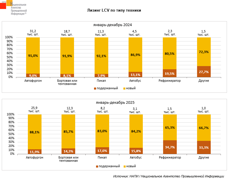 По данным маркетингового агентства НАПИ, за январь-декабрь 2025 года в лизинг было выдано 52,1 тыс. единиц новых и подержанных LCV*, что на 25% меньше, чем годом ранее, когда в лизинг было реализовано 69,5 тыс. ед.