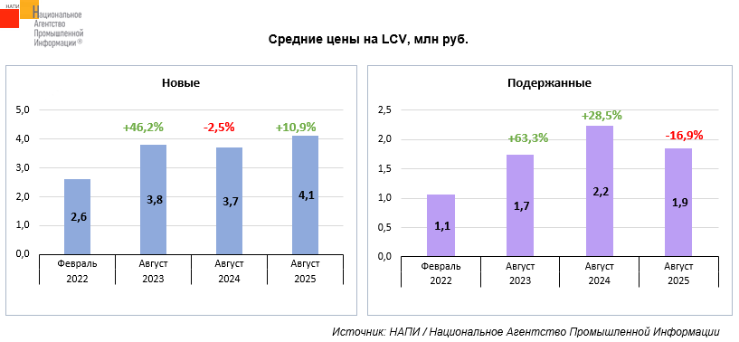 Маркетинговое агентство НАПИ проанализировало динамику средних цен на новые и подержанные* LCV**. Значительнее всего стоимость легких коммерческих автомобилей выросла в 2023 году. Так, в августе цены на новые LCV взлетели на 46,2%, на подержанные – на 63,3%. В августе 2025 года средняя цена на новый легкий коммерческий автомобиль достигла 4,1 млн рублей, что на 58,1% больше, чем в феврале 2022 года. Стоимость подержанного LCV составила 1,9 млн рублей, что на 74,2% выше его цены в феврале 2022 года. В прошлом месяце, по сравнению с августом 2024 года, средняя цена на новый легкий коммерческий автомобиль выросла на 10,9%, а на подержанный – снизилась на 16,9%.