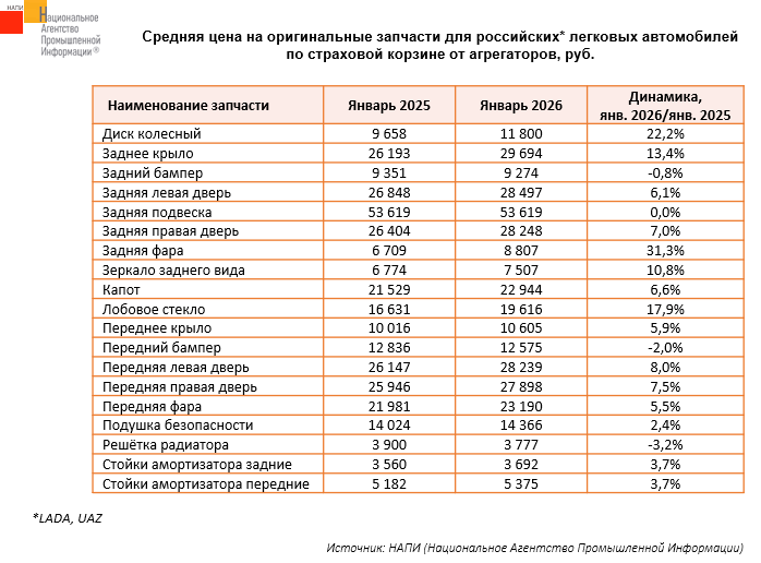 Маркетинговое агентство НАПИ проанализировало средние цены на оригинальные запчасти по страховой корзине для российских* легковых автомобилей от агрегаторов.