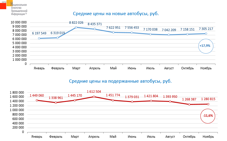 Согласно данным НАПИ (Национальное Агентство Промышленной Информации) средняя цена на новые автобусы (без учета LCV) в ноябре 2022 г. достигла отметки в 7,3 млн. руб. По сравнению с январем 2022 г. новые автобусы подорожали на 17,9%. В отличии от средней цены на новые автобусы, средняя цена на подержанные автобусы в ноябре текущего года снизилась на 11,6% по сравнению с январем, в основном за счет сокращения предложений по иностранным автобусам и более «свежим» автобусам.