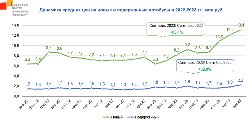 Маркетинговое агентство НАПИ проанализировало динамику цен на новые и подержанные автобусы (без учета LCV). Средние цены на новые автобусы с сентября 2022 г. по сентябрь 2023 г. выросли на 83,1% и достигли 13,1 млн. руб. По сравнению с августом новые автобусы подорожали на 7,6%.