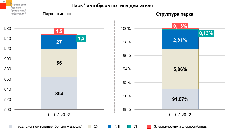 Согласно данным НАПИ в парке автобусов* на 01.07.2022 г. на долю электробусов и автобусов, использующих СПГ, приходится по 0,13%. Основной объем электробусов закупает Москва, большую часть автобусов на СПГ - Санкт-Петербург. В течении 2022 года в северную столицу должно быть поставлено порядка 2,4 тыс. автобусов на СПГ. Москва в 2022 г. планирует закупить 420 электробусов. Подавляющее же количество автобусов в России (864 тыс. шт.) использует традиционное автомобильное топливо - бензин или дизель.