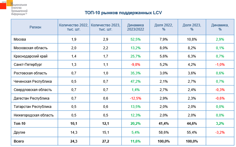 Согласно данным НАПИ (Национальное Агентство Промышленной Информации), рынок подержанных легких коммерческих автомобилей в январе 2023 года вырос на 11,6% по сравнению с январем прошлого года. Почти 11% подержанных автомобилей было реализовано в Москве, за год в столице продажи выросли на 52,5%. На долю Москвы, Московской области и Санкт-Петербурга пришлось 23,2% от всей подержанной техники, проданной в январе текущего года.