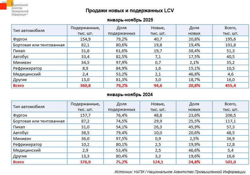 По данным маркетингового агентства НАПИ, за январь-ноябрь 2025 года было продано 455,4 тыс. единиц новых и подержанных LCV*, что на 9,1% меньше, чем годом ранее, когда было реализовано 501 тыс. Так, продажи подержанной техники сократились на 4,3%, а новой – на 23,8%.
