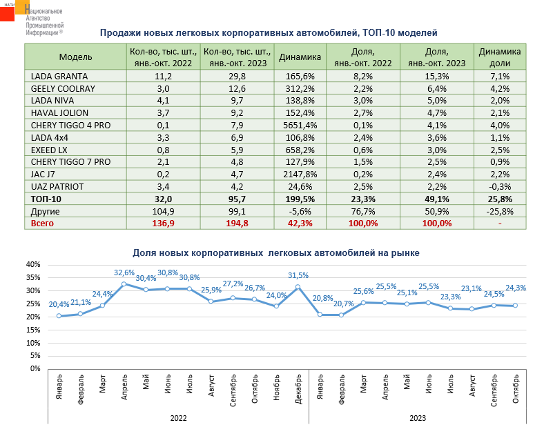 По данным маркетингового агентства НАПИ, за десять месяцев 2023 г. продажи новых легковых корпоративных автомобилей выросли на 42,3% и достигли 194,8 тыс. Доля корпоративных продаж на рынке новых легковых автомобилей по итогам десяти месяцев составила 24%. Годом ранее на корпоративных клиентов пришлось 25,4% рынка.