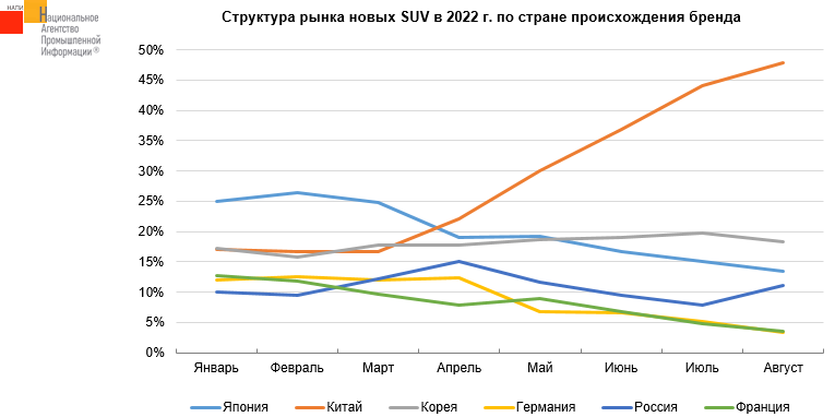 Согласно данным НАПИ (Национальное Агентство Промышленной Информации) в структуре продаж новых автомобилей сегмента SUV резко выросла доля китайских автомобилей. Если в январе 2022 г. доля китайских автомобилей составляла 17%, то уже в августе она поднялась до 48%. Доля японских автомобилей, которые являлись лидерами в этом сегменте в январе – марте, сократилась с 25-26% до 13,5% в августе.