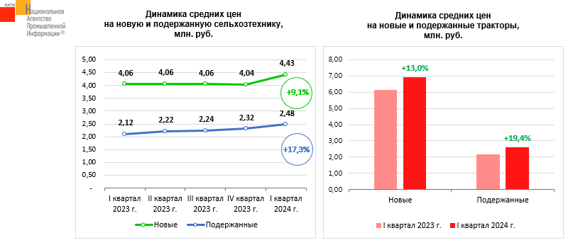 В первом квартале 2024 года средние цены на новую сельхозтехнику выросли на 9,1% по сравнению с первым кварталом прошлого года и составили 4,4 млн. руб. Средние цены на подержанную сельхозтехнику за год выросли на 17,3%. и достигли 2,5 млн. руб.