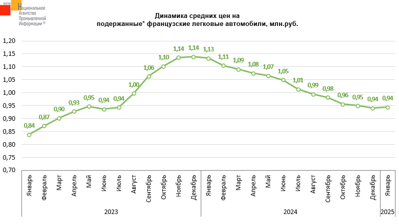 Маркетинговое агентство НАПИ проанализировало динамику средних цен на подержанные* автомобили французских брендов. Пик роста цен на популярные в недавнем прошлом автомобили пришелся на август-декабрь 2023 года, с января 2024 года цены плавно снижались. Тем не менее, в январе 2025 года средняя цена на французский подержанный легковой автомобиль на 12,7% выше средней цены в январе 2023 года. По сравнению же с январем 2024 года средняя цена снизилась на 16,6%.