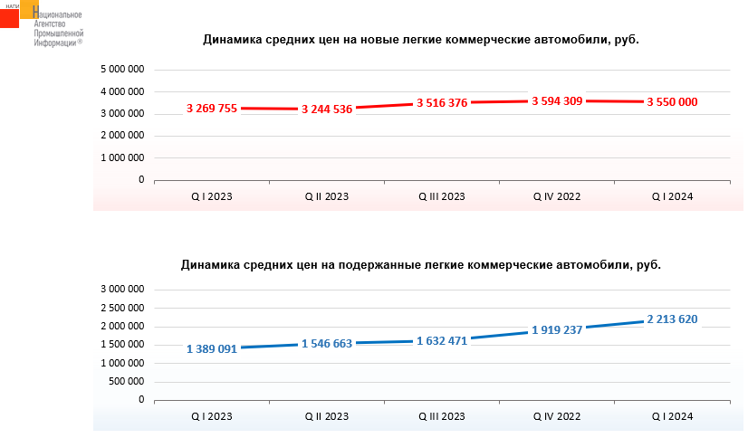 По данным маркетингового агентства НАПИ, в первом квартале 2024 года средняя цена на новые легкие коммерческие автомобили выросла на 8,6% по сравнению с первым кварталом 2023 года и достигла 3,5 млн. руб. За год средняя цена на подержанные легкие коммерческие автомобили выросла на 59,3% и достигла 2,2 млн. руб.