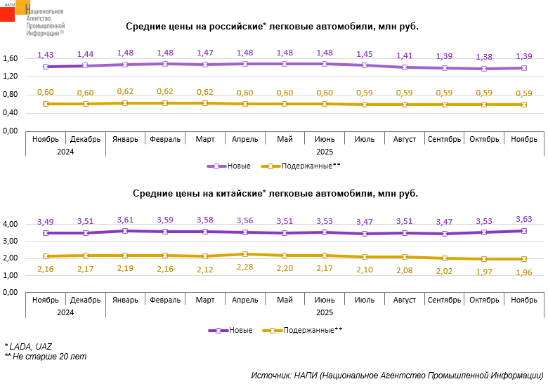За год, с ноября 2024 года по ноябрь 2025 года, средняя цена на новые традиционные российские* легковушки снизилась на 2,7%, на подержанные** – на 2,9%. В то же время средняя цена на новые китайские легковые автомобили выросла на 4%, а на подержанные сократилась на 9%.