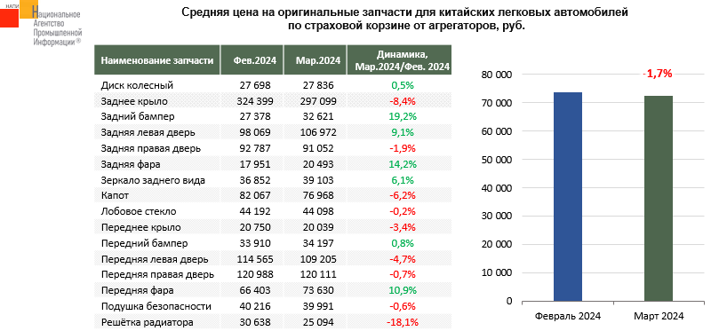 Маркетинговое агентство НАПИ проанализировало цены на оригинальные запчасти по страховой корзине для китайских легковых автомобилей от агрегаторов. В марте 2024 года по сравнению с февралем 2024 средняя цена на оригинальные запчасти снизилась на 1,7%.