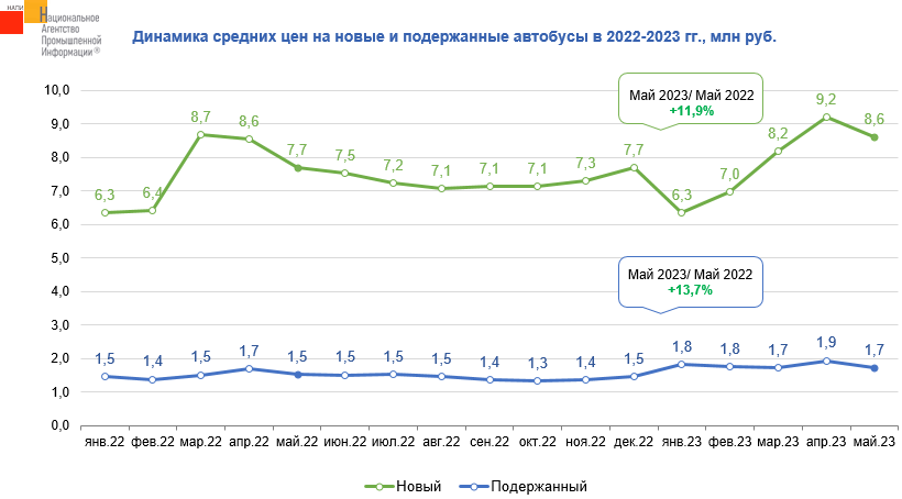 Цены на новые автобусы с мая 2022 г. по май 2023 г. выросли на 11,9%. Подержанные автобусы за год подорожали на 13,7%.