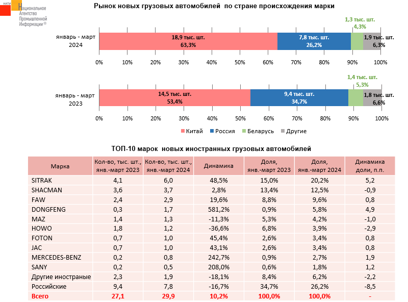 По данным маркетингового агентства НАПИ, по итогам первого квартала текущего года продажи новых российских грузовых автомобилей снизились на 16,7%, в то время как продажи китайской техники выросли на 30,5%. Интересно отметить, что в десятку лидирующих иностранных марок вошел MERCEDES-BENZ, продажи которого взлетели на 242,7%.