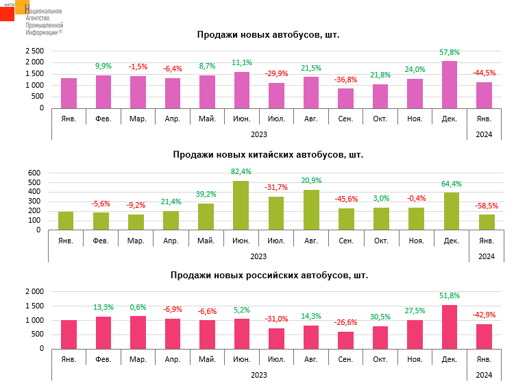 По данным маркетингового агентства НАПИ, в январе 2024 года рынок новых автобусов сократился на 12,7% по сравнению с январем 2023 года. Продажи новых китайских автобусов снизились сильнее рынка (-16,8%), рекордным месяцем для китайской техники стал июнь 2023 г., когда было реализовано 0,5 тыс. новых автобусов. Продажи российских автобусов в январе текущего года сократились на 13% по сравнению с январем 2023 года.