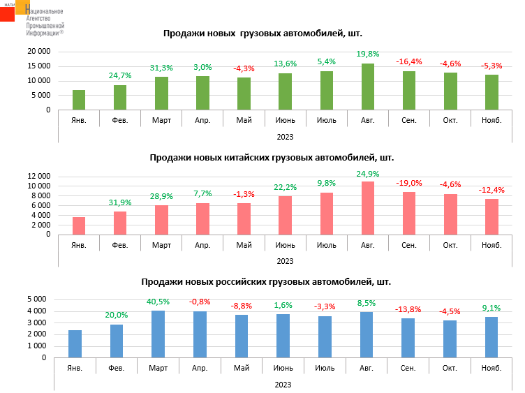 По данным маркетингового агентства НАПИ, за январь-ноябрь 2023 года рынок новых грузовых автомобилей вырос на 76,4%. Всего за одиннадцать месяцев было продано 130,9 тыс. новых грузовиков. Тем не менее с сентября продажи относительно предыдущего месяца сокращаются, в первую очередь за счет высоких темпов снижения продаж китайской техники. В текущем году было продано 80 тыс. китайских грузовиков, + 275,9% к одиннадцати месяцам 2022 года. Интересно отметить, что продажи российских грузовиков выросли в ноябре относительно октября 2023 года. Всего же в текущем году было продано 38,4 тыс. российских грузовых автомобилей (+ 1,4%).
