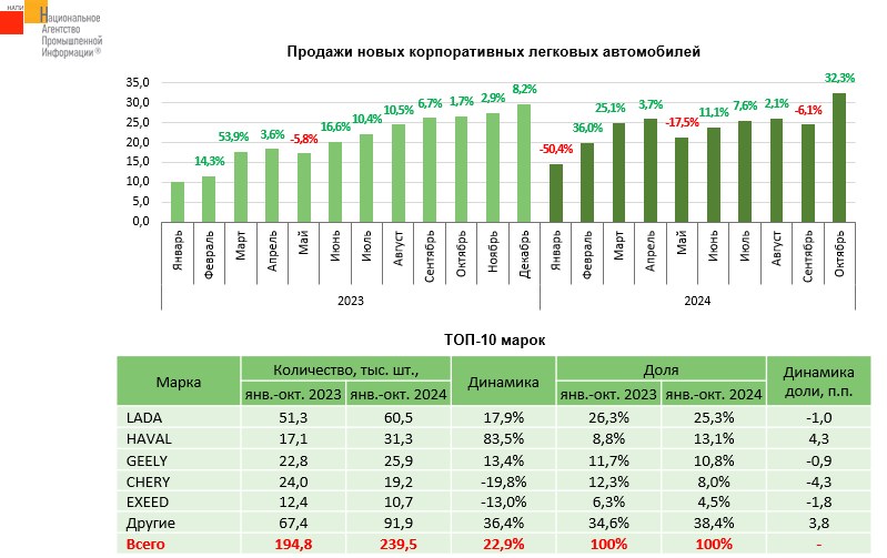 По данным маркетингового агентства НАПИ, продажи новых легковых автомобилей корпоративным клиентам за десять месяцев 2024 года выросли на 22,9%. В октябре текущего года корпоративные клиенты приобрели 32,4 тыс. новых легковых автомобилей, это максимальное количество с января 2023 года. Чуть больше четверти всех продаж в текущем году пришлось на автомобили LADA. Среди иномарок корпоративные клиенты предпочитают HAVAL, доля которого за год выросла на 4,3%.