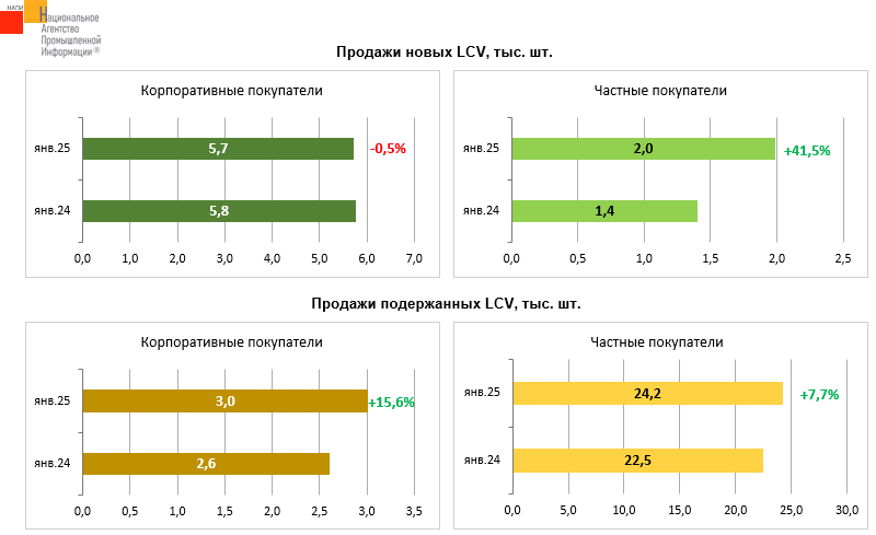 Маркетинговое агентство НАПИ (Национальное Агентство Промышленной Информации) проанализировало продажи легких коммерческих автомобилей (LCV)* в январе 2025 года. Продажи новой техники корпоративным покупателям снизились на 0,5% по сравнению с январем прошлого года, тогда как продажи частным покупателям выросли на 41,5%. На рынке подержанной техники вырос спрос и со стороны корпоративных, и со стороны частных покупателей, на 15,6% и 7,7% соответственно.