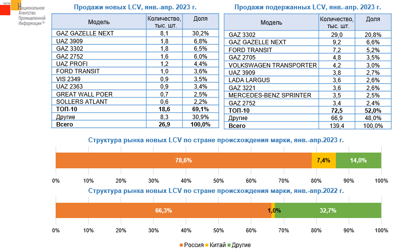 По данным маркетингового агентства НАПИ, за 4 месяца 2023 года рынок подержанных легких коммерческих автомобилей вырос на 16%, со 120,1 тыс. по итогам января-апреля прошлого года до 139,4 тыс. Рынок новой техники за этот же период сократился на 17,4%. Так за 4 месяца прошлого года было продано 32,6 тыс. новых LCV, за 4 месяца текущего года – 26,9 тыс. Китайские производители пока не очень активно осваивают этот сегмент, в отличии от рынка легковых и грузовых автомобилей. Тем не менее за год доля китайской техники выросла с 1% до 7,4% на рынке новых LCV.