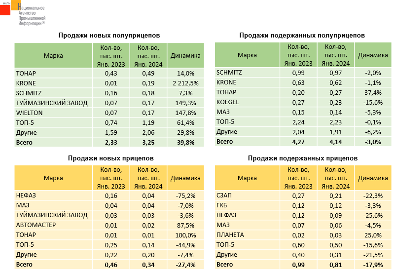 По данным маркетингового агентства НАПИ, продажи новых полуприцепов в январе 2024 г. выросли на 39,8%, тогда как продажи подержанных снизились на 3,0%. Рынок же новых и подержанных прицепов в январе 2024 г. сократился на 27,4% и 17,9% соответственно.