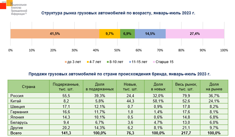 По данным маркетингового агентства НАПИ, за семь месяцев 2023 г. было продано 217,7 тыс. новых и подержанных грузовиков, что на 34% больше, чем за аналогичный период прошлого года. Наибольшим спросом пользовались грузовики возрастом до 3 лет (41,5%), доля «возрастных» грузовых автомобилей (старше 15 лет) в структуре рынка новой и подержанной техники существенно ниже – 27,4%. Продажи подержанной российской техники более чем в 2 раза превышают продажи новой. У китайских грузовиков, наоборот, продажи новых в 5,5 раз превышают продажи подержанных.