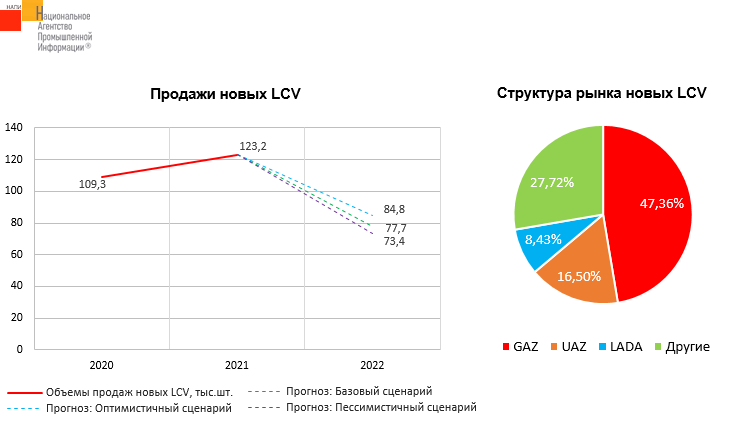 Маркетинговое агентство НАПИ (Национальное Агентство Промышленной Информации) обновило прогноз рынка новых легких коммерческих автомобилей. При сохранении текущих тенденций к концу 2022 г. в базовом варианте сценария рынок может сократиться на -36,9%. В пессимистичном варианте рынок упадет на 40,4%, в оптимистичном варианте снижение продаж составит -31,2%. Автомобили GAZ займут чуть больше порядка 47% рынка в текущем году.