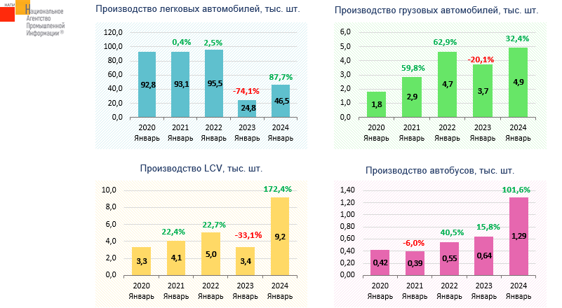 По данным маркетингового агентства НАПИ, в январе 2024 года производство коммерческой техники достигло исторического максимума за 5 лет. Производство легковых автомобилей так и не вышло на докризисный уровень, тем не менее по сравнению с январем прошлого года выпуск легковых автомобилей вырос на 87,7%. Наибольший рост по сравнению с прошлым годом продемонстрировали легкие коммерческие автомобили (+172,4%) и автобусы (+101,6%).