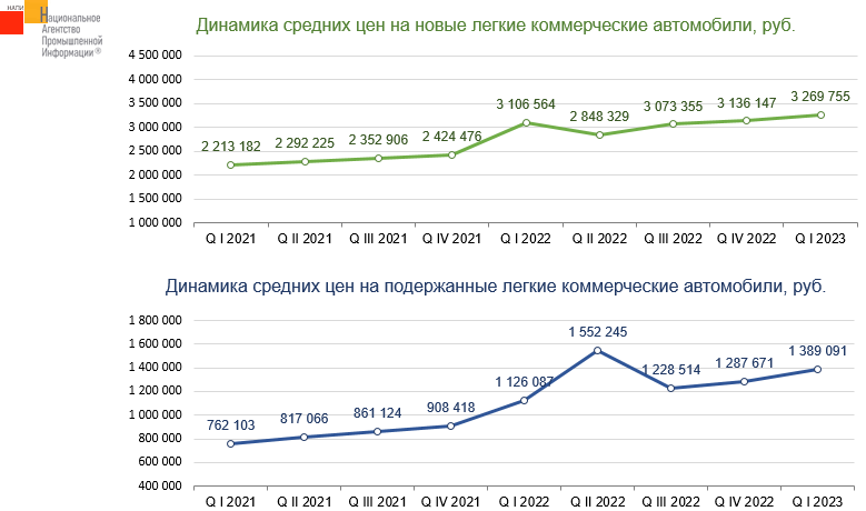 Согласно данным НАПИ (Национальное Агентство Промышленной Информации), по итогам 1 квартала 2023 года средняя цена на новые легкие коммерческие автомобили (РРЦ) выросла на 4,3% по сравнению с 4 кварталом 2022 года.