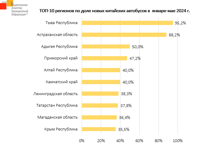По данным маркетингового агентства НАПИ в январе-мае 2024 года продажи новых китайских автобусов выросли на 27,7%. Всего за пять месяцев было продано 1,3 тыс. автобусов китайских брендов. Доля китайских автобусов на российском рынке достигла 15,4%, в 34 регионах эта доля была еще выше. Лидерами по доле китайских автобусов по итогам пяти месяцев стали Республика Тыва и Астраханская область.